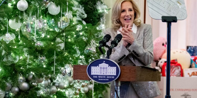 Jill Biden, the First Lady, has become a topic of conversation on social media after a group of children joyfully wished her a “Happy Christmas” in response to her “Happy Holidays” greeting during a toy drive at the White House this past Friday.